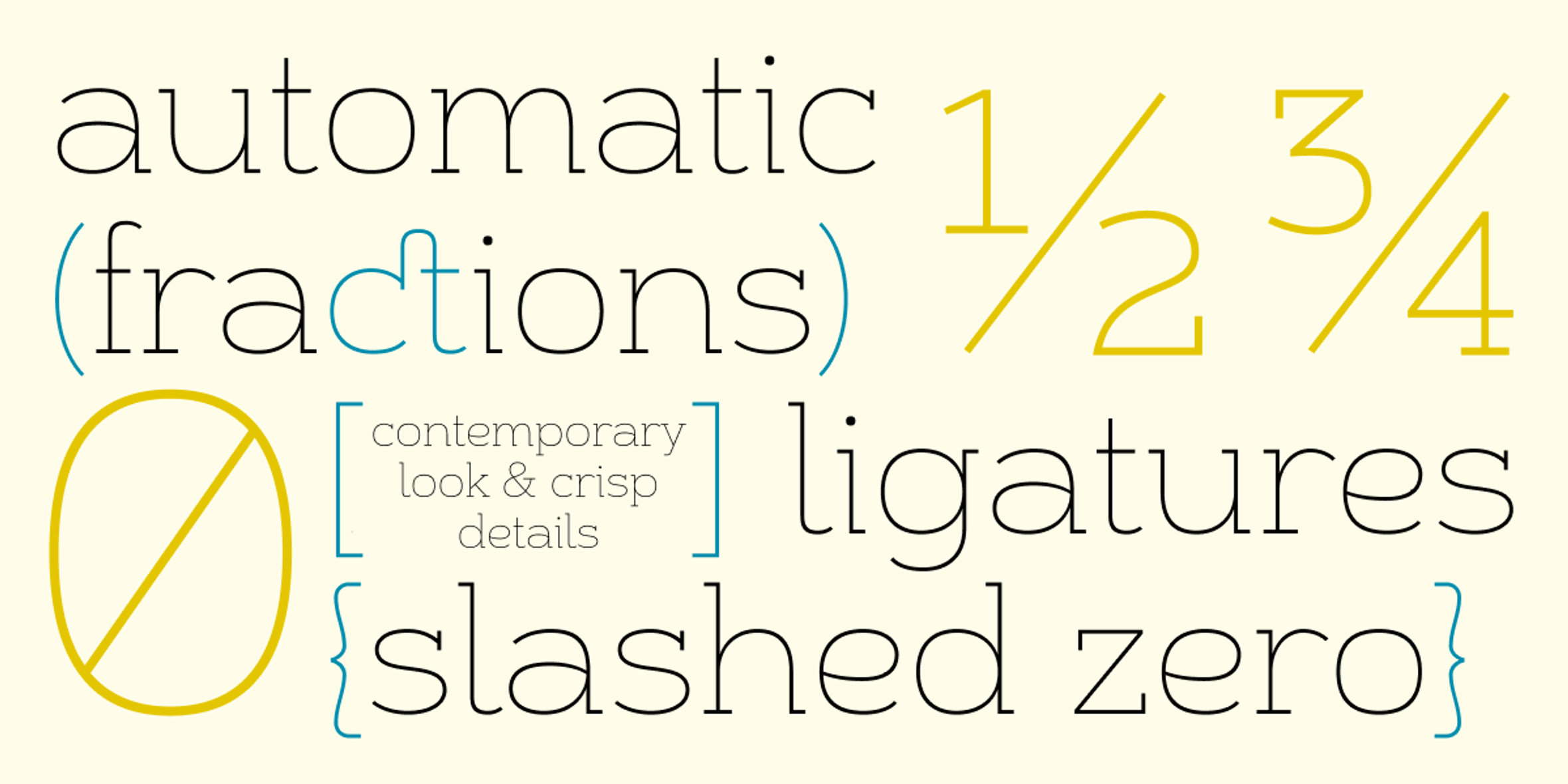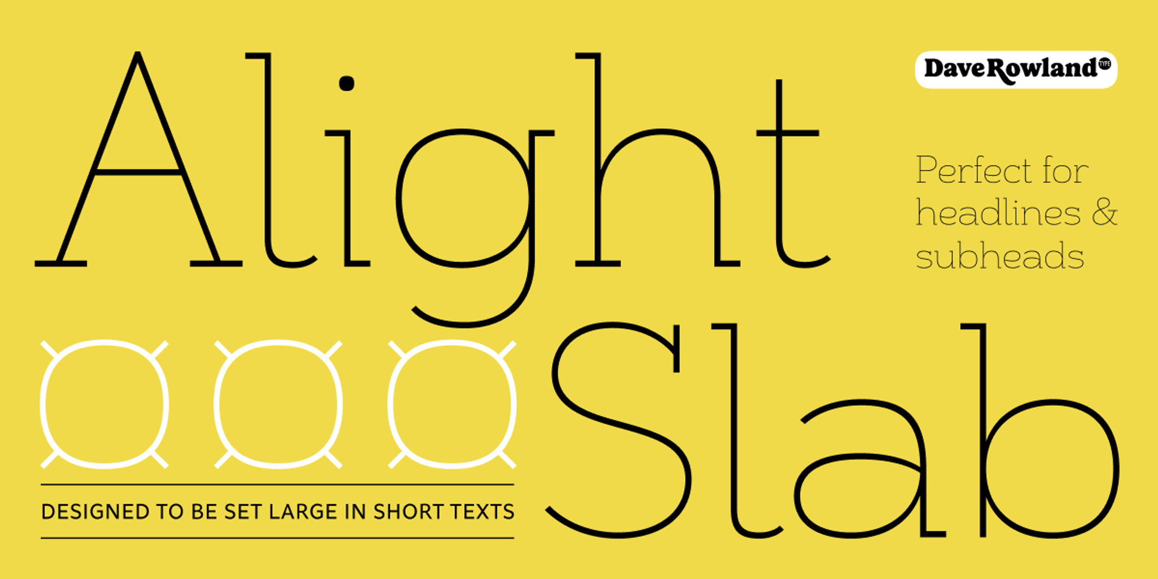 Alight Slab is, wait for it… A light slab! Designed to be set large, in headlines or subheads and (very) short paragraphs of running text. It has slightly super-elliptical forms and crisp details, giving it a contemporary look. Alight Slab features automatic fractions, a discretionary ct ligature, and a capital sharp s. Look no further than Anultra Slab for an ultra-bold accompanying typeface.