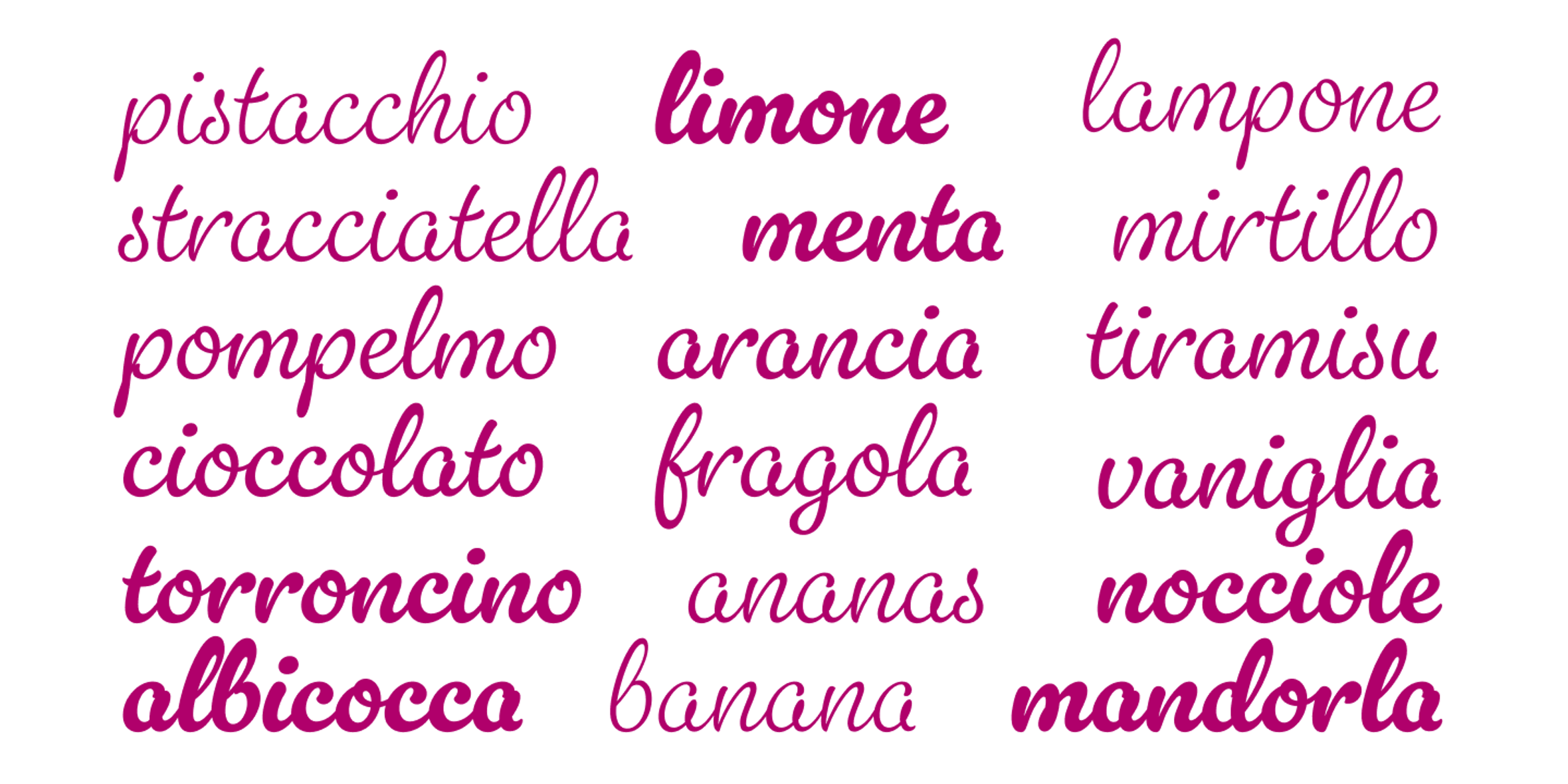 Gelato Fresco is a brush-style script family first created in 2011 as the popular Gelato Script. What was always typographically refined and versatile has reached new levels of usability with six weights. From the start, this design has graced everything from designer handbags to prime-time TV shows, food blogs, wedding invitations, glossy magazines, and ice cream shops. You can effortlessly change the feel with the many features available, and it will work like a charm right out of the box.