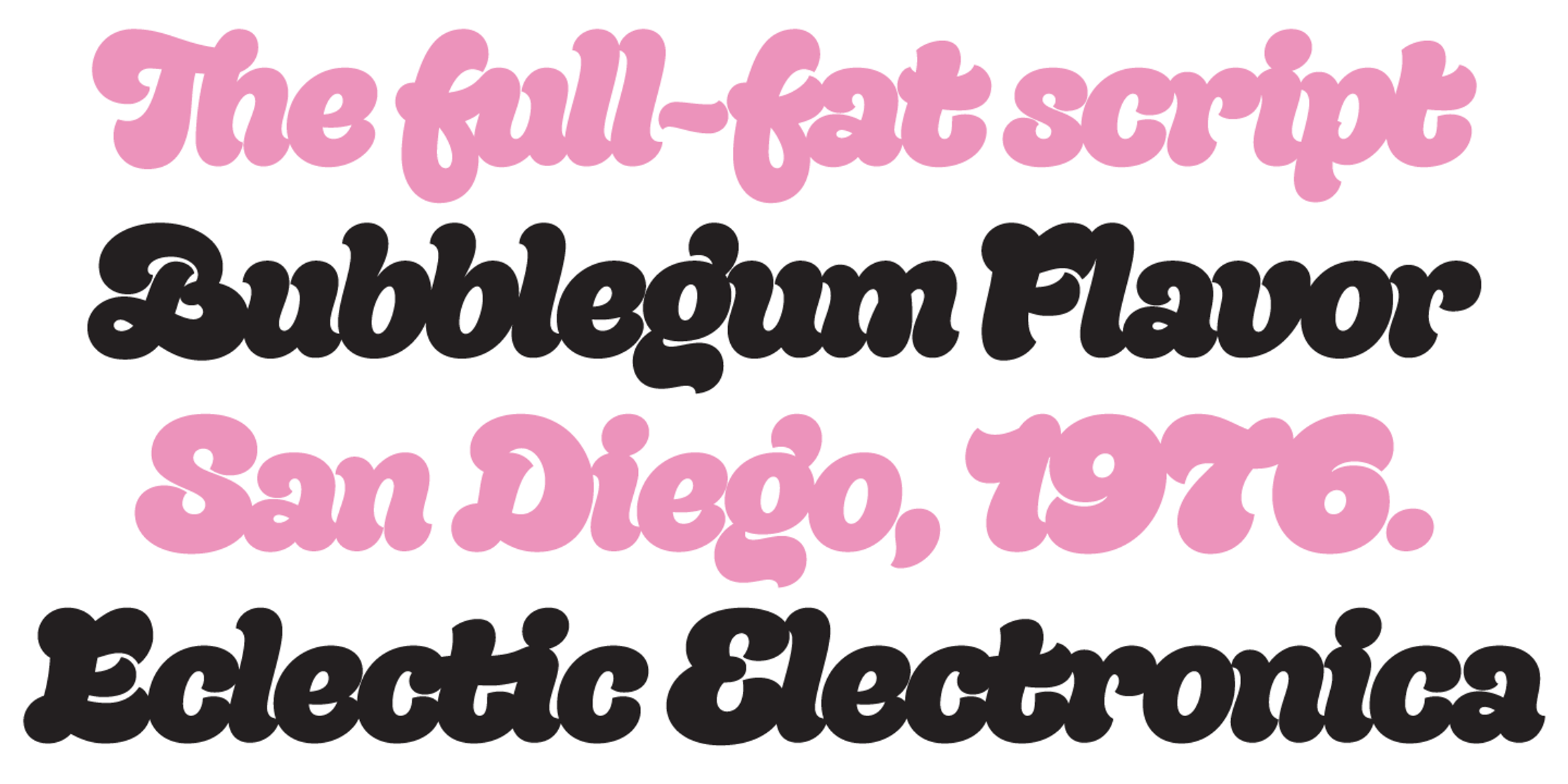 This is Quinella, plumper than a misguided Z-lister’s dodgy lip job. Named after those cheffy scoops of ice cream, quenelles. It’s a cute, voluptuous script with a seventies vibe and a personality all its own. It’s non-connecting in the usual sense, but the letters overlap to make the white space as tiny as possible. The full-fat, creamy appearance makes it perfect for food packaging, but don’t let it end there; it’ll make memorable logos, unmissable headlines, and posters with more punch.