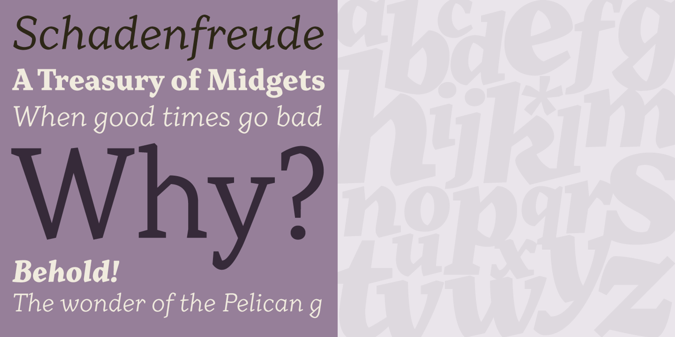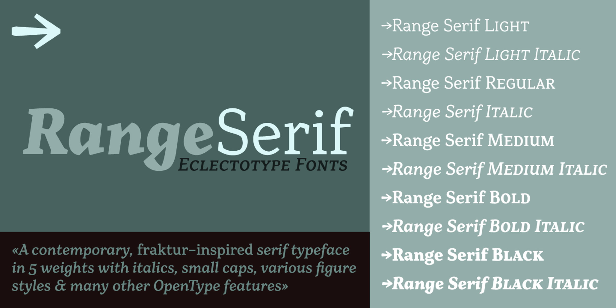 Range Serif is a sharp, contemporary wedge serif family with just a hint of fraktur influence. This typeface is designed for a graphic designer’s demanding typographic work; it’s legible at small sizes, but unique at display sizes. Range Serif is a versatile and fully-featured typeface, ideal for corporate identities, educational textbooks, contemporary art catalogs, and maybe even t-shirt slogans. There are five weights, from light to black, each with corresponding italics.